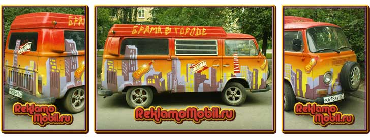 Старенький микроавтобус "Фольксваген", принимавший участие в рекламной акции "Брама в городе" (пивной бренд Brahma). В рамках этой акции любой желающий мог создать на интернет-сайте свой БРАМАмобиль и раскрасить его. Акция имела мощную поддержку как в онлайне, так и в оффлайне. После ее окончания микроавтобус был запаркован недалеко от Фрунзенской набережной (напротив Парка Культуры), радуя прохожих яркой раскраскй и бесплатно рекламируя находчивый пивной бренд.
